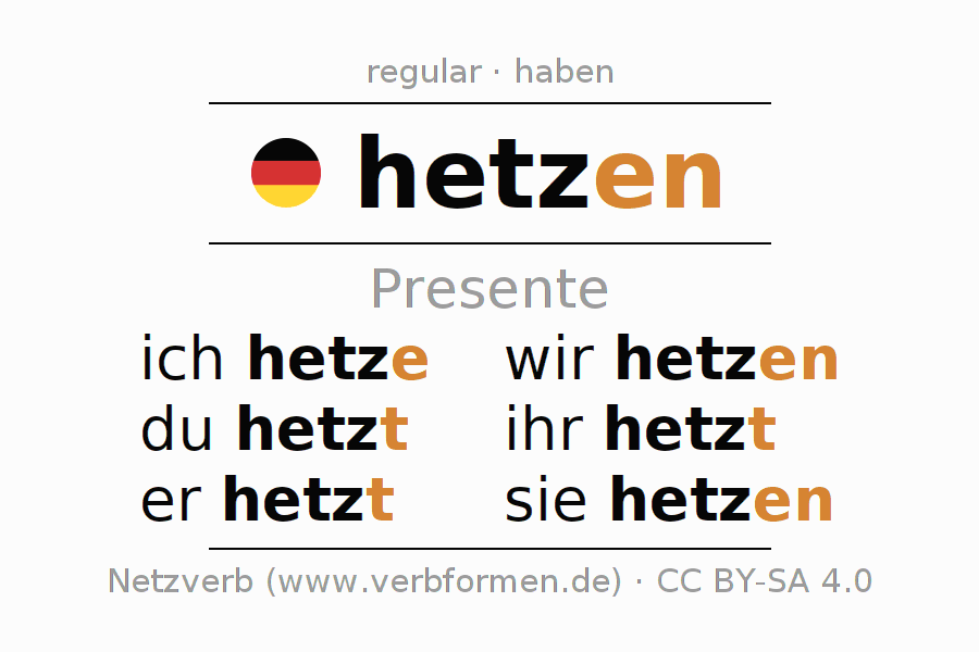 O verbo hetzen é totalmente conjugado em todas as pessoas e números no Presente Indicativo