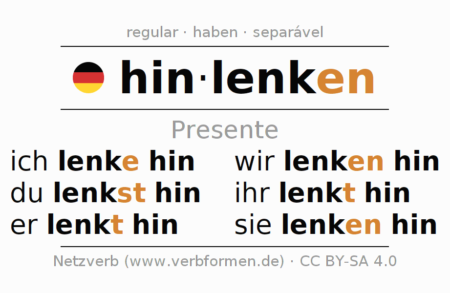 As formas de conjugação do verbo hinlenken (direcionar, focar) no presente são: ich lenke hin, du lenkst hin, er lenkt hin, wir lenken hin, ihr lenkt hin, sie lenken hin