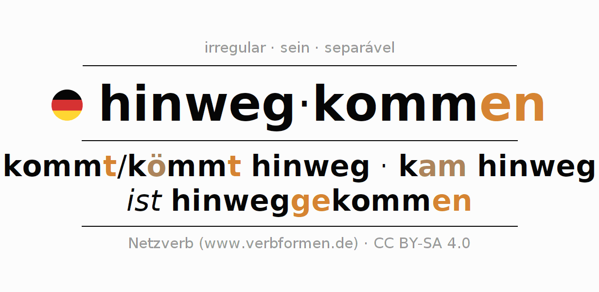 As formas de conjugação do verbo hinwegkommen (superar, ultrapassar) no presente são: ich komme hinweg, du kommst/kömmst hinweg, er kommt/kömmt hinweg, wir kommen hinweg, ihr kommt hinweg, sie kommen hinweg