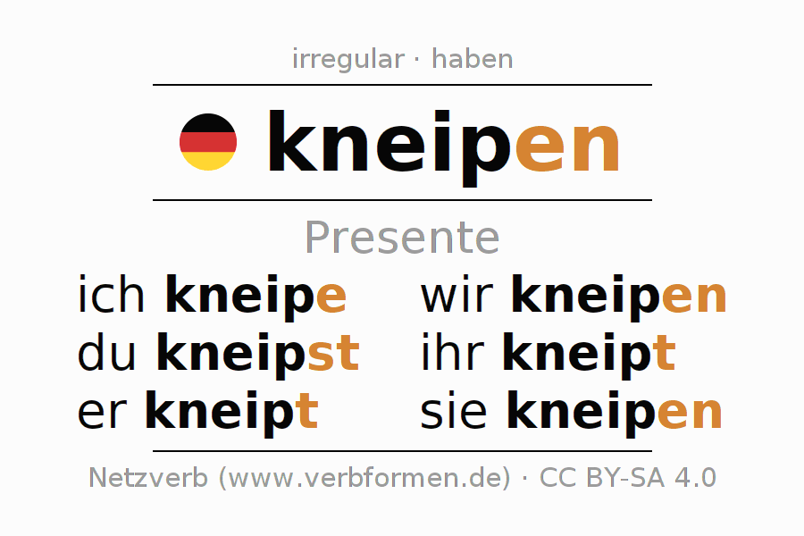 O verbo kneipen (unr) é totalmente conjugado em todas as pessoas e números no Presente Indicativo