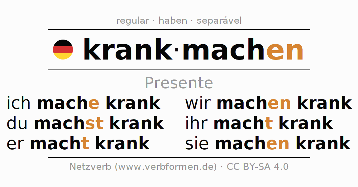 As formas de conjugação do verbo krankmachen (adoecer, causar doença) no presente são: ich mache krank, du machst krank, er macht krank, wir machen krank, ihr macht krank, sie machen krank
