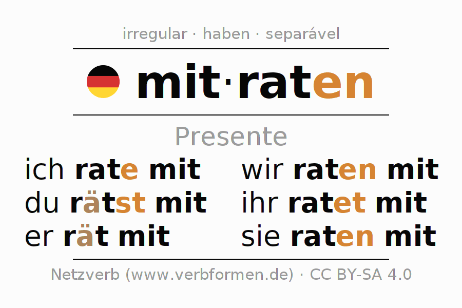 As formas de conjugação do verbo mitraten (adivinhar juntos, participar juntos) no presente são: ich rate mit, du rätst mit, er rät mit, wir raten mit, ihr ratet mit, sie raten mit