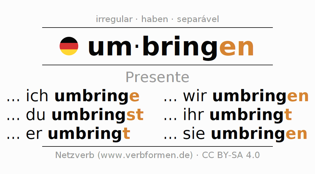 A conjugação do verbo umbringen no Ativo Presente Indicativo Presente é: ... ich umbringe, ... du umbringst, ... er umbringt, ... wir umbringen, ... ihr umbringt, ... sie umbringen.A formação dessas formas segue determinadas regras gramaticais. Os requisitos para a conjugação do verbo como forma verbal simples no umbringen do Presente. Comentários ☆