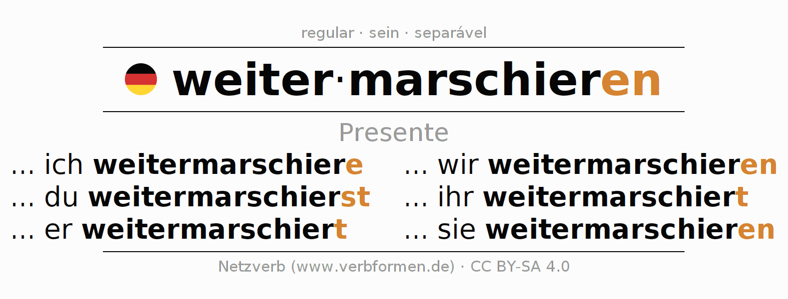 O verbo weitermarschieren é totalmente conjugado em todas as pessoas e números no Presente Indicativo