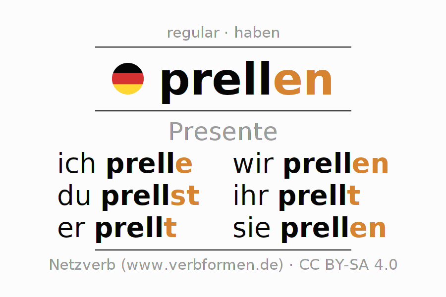 As formas de conjugação do verbo prellen (enganar, machucar) no presente são: ich prelle, du prellst, er prellt, wir prellen, ihr prellt, sie prellen