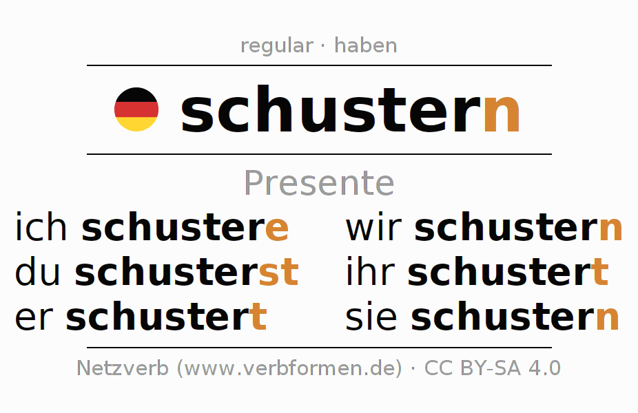 As formas de conjugação do verbo schustern (confeccionar, fazer de qualquer jeito) no presente são: ich schust(e)re, du schusterst, er schustert, wir schustern, ihr schustert, sie schustern