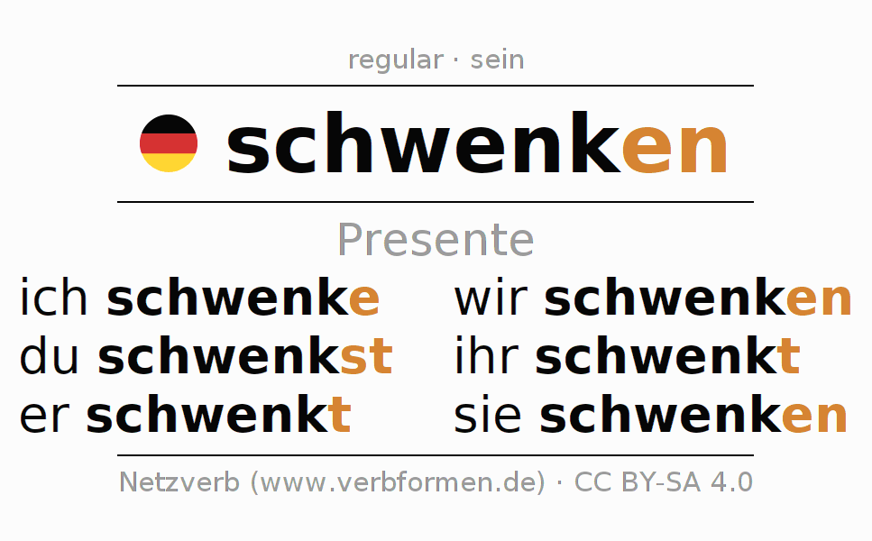 As formas de conjugação do verbo schwenken (mover, virar) no presente são: ich schwenke, du schwenkst, er schwenkt, wir schwenken, ihr schwenkt, sie schwenken