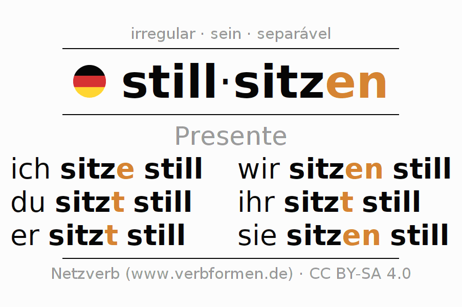 As formas de conjugação do verbo stillsitzen (ficar sentado) no presente são: ich sitze still, du sitzt still, er sitzt still, wir sitzen still, ihr sitzt still, sie sitzen still