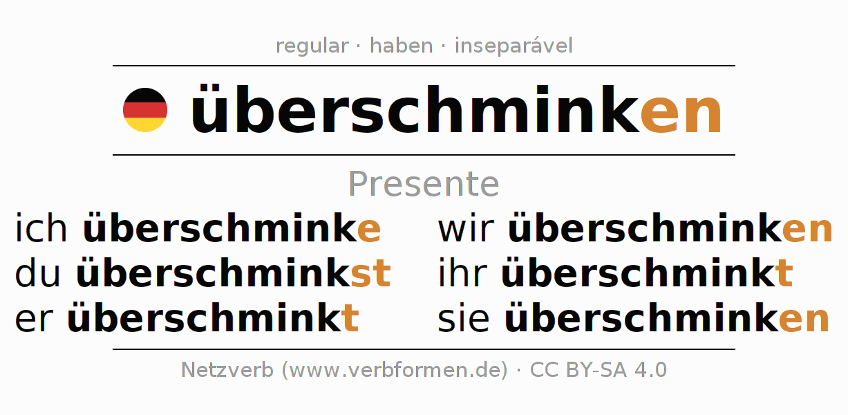 As formas de conjugação do verbo überschminken (cobrir com maquiagem, maquiar) no presente são: ich überschminke, du überschminkst, er überschminkt, wir überschminken, ihr überschminkt, sie überschminken