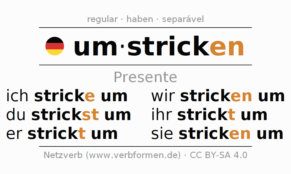 As formas de conjugação do verbo umstricken (desmanchar, reconstruir) no presente são: ich stricke um, du strickst um, er strickt um, wir stricken um, ihr strickt um, sie stricken um