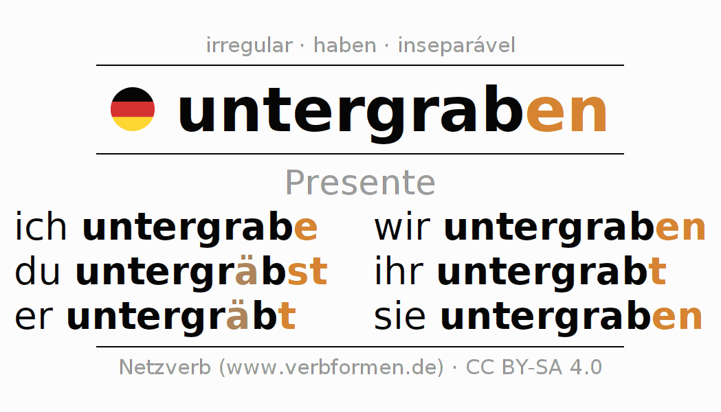 As formas de conjugação do verbo untergraben (destruir, minar) no presente são: ich untergrabe, du untergräbst, er untergräbt, wir untergraben, ihr untergrabt, sie untergraben