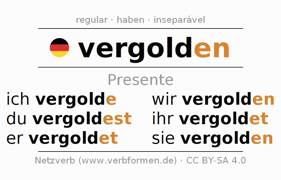 As formas de conjugação do verbo vergolden (dourar, folhear) no presente são: ich vergolde, du vergoldest, er vergoldet, wir vergolden, ihr vergoldet, sie vergolden