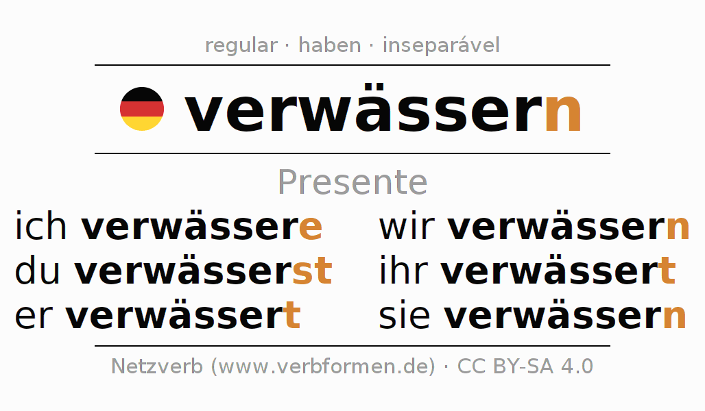 As formas de conjugação do verbo verwässern (diluir, aguar) no presente são: ich verwäss(e)re, du verwässerst, er verwässert, wir verwässern, ihr verwässert, sie verwässern