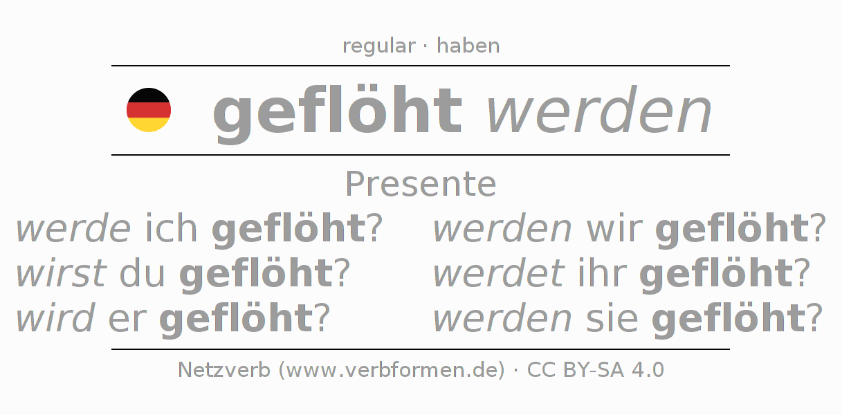 A conjugação do verbo flöhen no Voz Passiva Presente Indicativo Presente é: werde ich geflöht?, wirst du geflöht?, wird er geflöht?, werden wir geflöht?, werdet ihr geflöht?, werden sie geflöht?.A formação dessas formas segue determinadas regras gramaticais. Os requisitos para a conjugação do verbo como forma verbal simples no flöhen do Presente. Comentários ☆