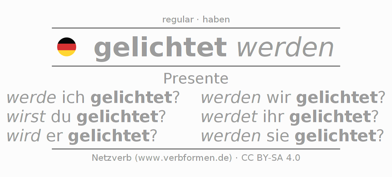 A conjugação do verbo lichten no Voz Passiva Presente Indicativo Presente é: werde ich gelichtet?, wirst du gelichtet?, wird er gelichtet?, werden wir gelichtet?, werdet ihr gelichtet?, werden sie gelichtet?.A formação dessas formas segue determinadas regras gramaticais. Os requisitos para a conjugação do verbo como forma verbal simples no lichten do Presente. Comentários ☆