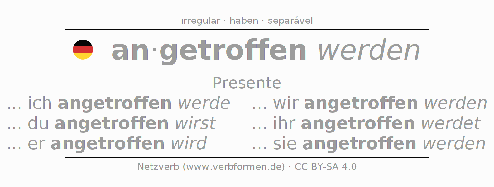 O verbo antreffen é totalmente conjugado em todas as pessoas e números no Presente Indicativo