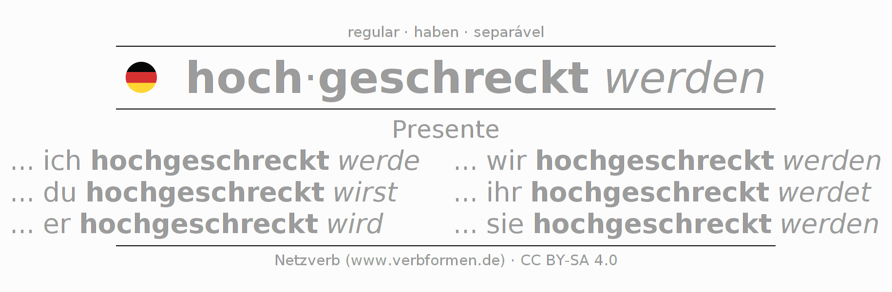 O verbo hochschrecken (regelm) (hat) é totalmente conjugado em todas as pessoas e números no Presente Indicativo
