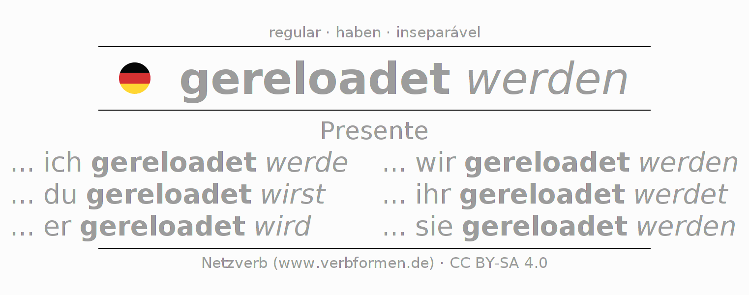 A conjugação do verbo reloaden no Voz Passiva Presente Indicativo Presente é: ... ich gereloadet werde, ... du gereloadet wirst, ... er gereloadet wird, ... wir gereloadet werden, ... ihr gereloadet werdet, ... sie gereloadet werden.A formação dessas formas segue determinadas regras gramaticais. Os requisitos para a conjugação do verbo como forma verbal simples no reloaden do Presente. Comentários ☆
