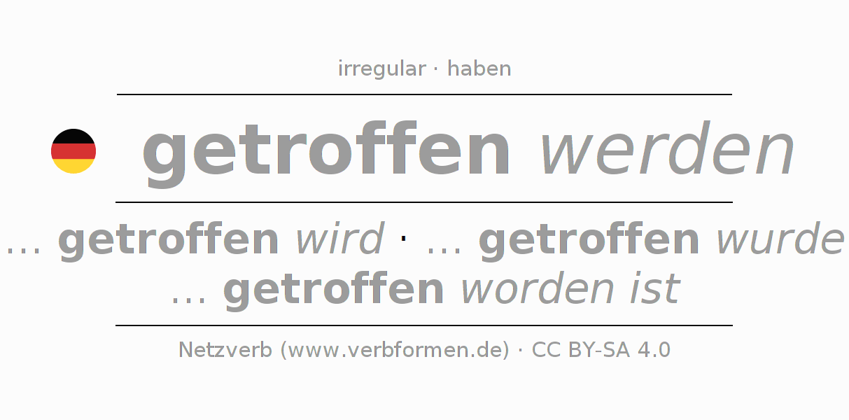 A conjugação do verbo treffen no Voz Passiva Presente Indicativo Presente é: ... ich getroffen werde, ... du getroffen wirst, ... er getroffen wird, ... wir getroffen werden, ... ihr getroffen werdet, ... sie getroffen werden.A formação dessas formas segue determinadas regras gramaticais. Os requisitos para a conjugação do verbo como forma verbal simples no treffen do Presente. Comentários ☆