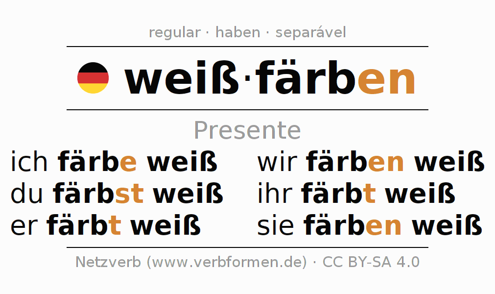 As formas de conjugação do verbo weißfärben (branquear) no presente são: ich färbe weiß, du färbst weiß, er färbt weiß, wir färben weiß, ihr färbt weiß, sie färben weiß
