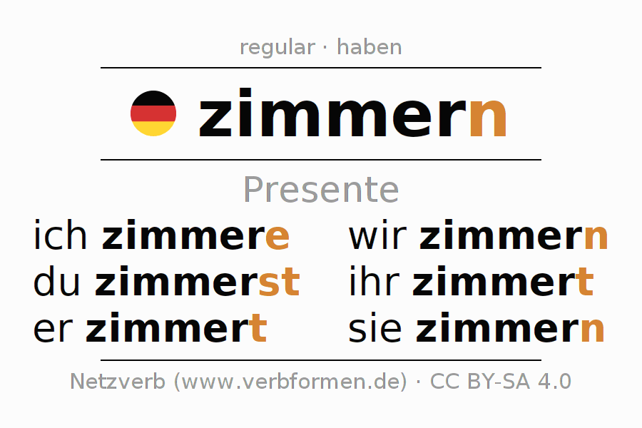 O verbo zimmern é totalmente conjugado em todas as pessoas e números no Presente Indicativo