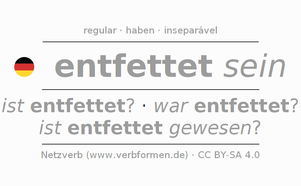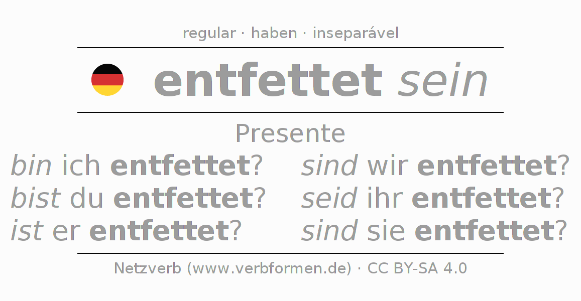 A conjugação do verbo entfetten no Estado passivo Presente Indicativo Presente é: bin ich entfettet?, bist du entfettet?, ist er entfettet?, sind wir entfettet?, seid ihr entfettet?, sind sie entfettet?.A formação dessas formas segue determinadas regras gramaticais. Os requisitos para a conjugação do verbo como forma verbal simples no entfetten do Presente. Comentários ☆