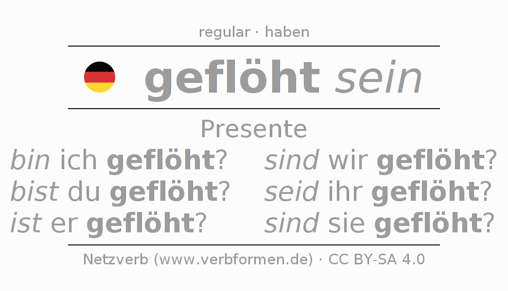 A conjugação do verbo flöhen no Estado passivo Presente Indicativo Presente é: bin ich geflöht?, bist du geflöht?, ist er geflöht?, sind wir geflöht?, seid ihr geflöht?, sind sie geflöht?.A formação dessas formas segue determinadas regras gramaticais. Os requisitos para a conjugação do verbo como forma verbal simples no flöhen do Presente. Comentários ☆