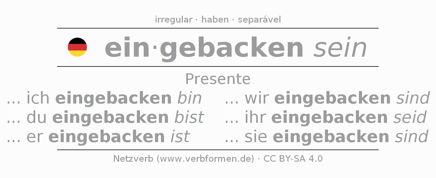 O verbo einbacken (unr) é totalmente conjugado em todas as pessoas e números no Presente Indicativo