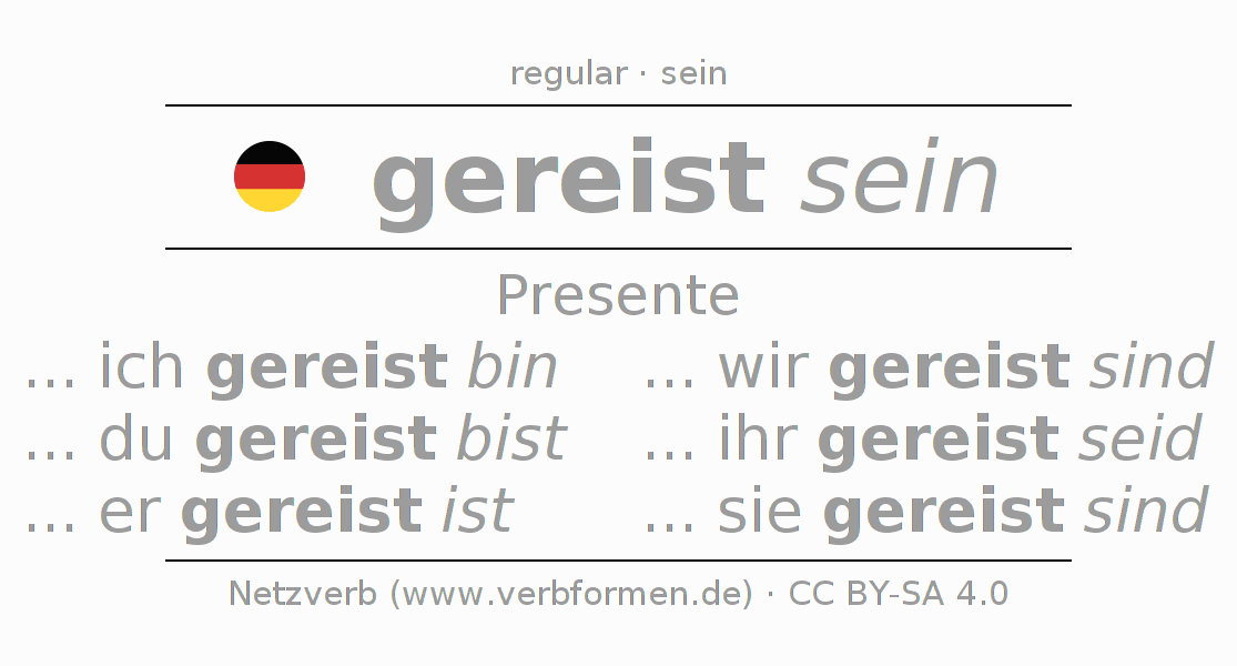 A conjugação do verbo reisen no Estado passivo Presente Indicativo Presente é: ... ich gereist bin, ... du gereist bist, ... er gereist ist, ... wir gereist sind, ... ihr gereist seid, ... sie gereist sind.A formação dessas formas segue determinadas regras gramaticais. Os requisitos para a conjugação do verbo como forma verbal simples no reisen do Presente. Comentários ☆