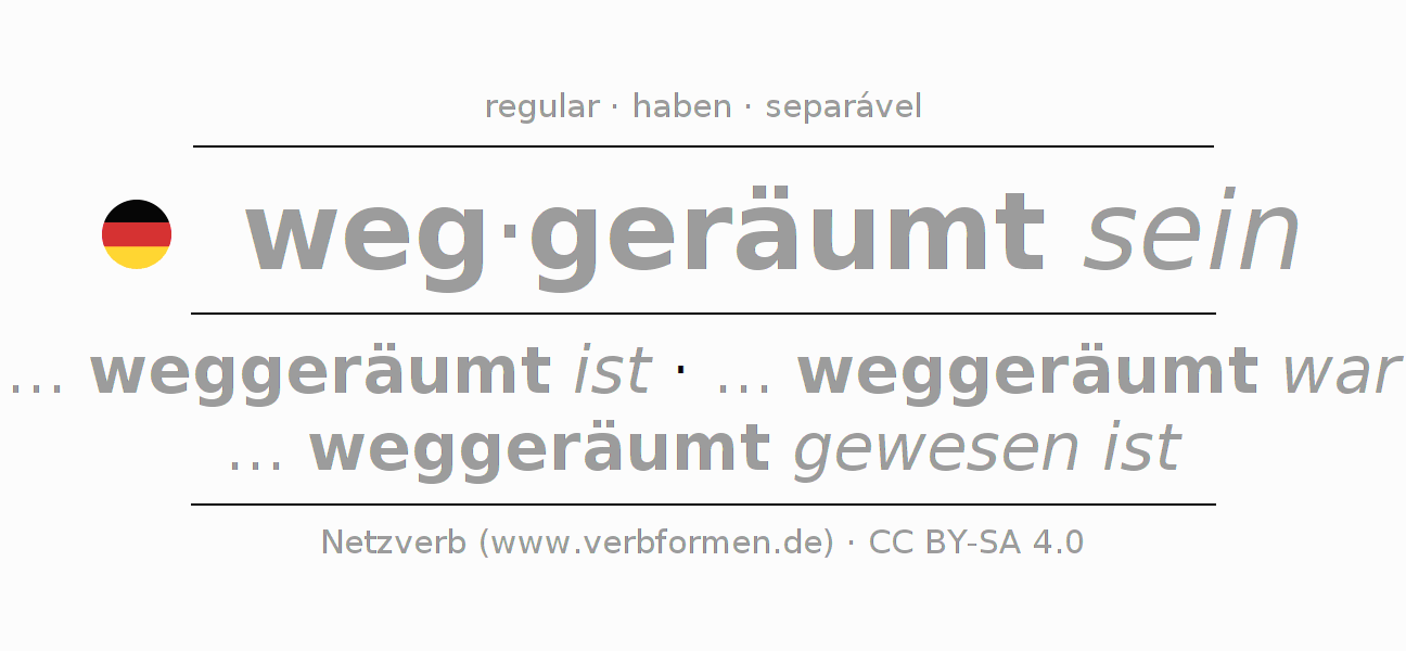 A conjugação do verbo wegräumen no Estado passivo Presente Indicativo Presente é: ... ich weggeräumt bin, ... du weggeräumt bist, ... er weggeräumt ist, ... wir weggeräumt sind, ... ihr weggeräumt seid, ... sie weggeräumt sind.A formação dessas formas segue determinadas regras gramaticais. Os requisitos para a conjugação do verbo como forma verbal simples no wegräumen do Presente. Comentários ☆