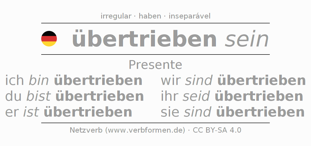 A conjugação do verbo übertreiben no Estado passivo Presente Indicativo Presente é: ich bin übertrieben, du bist übertrieben, er ist übertrieben, wir sind übertrieben, ihr seid übertrieben, sie sind übertrieben.A formação dessas formas segue determinadas regras gramaticais. Os requisitos para a conjugação do verbo como forma verbal simples no übertreiben do Presente. Comentários ☆