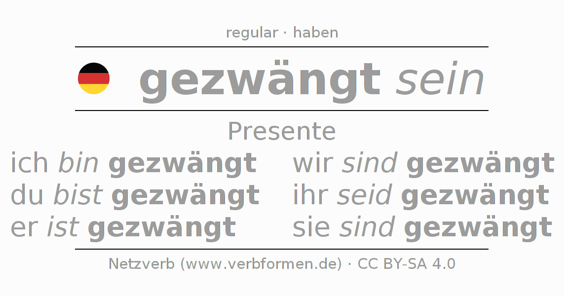 A conjugação do verbo zwängen no Estado passivo Presente Indicativo Presente é: ich bin gezwängt, du bist gezwängt, er ist gezwängt, wir sind gezwängt, ihr seid gezwängt, sie sind gezwängt.A formação dessas formas segue determinadas regras gramaticais. Os requisitos para a conjugação do verbo como forma verbal simples no zwängen do Presente. Comentários ☆