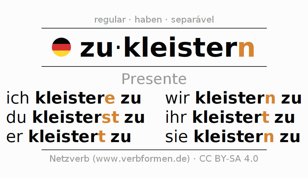 As formas de conjugação do verbo zukleistern (colar, tapar) no presente são: ich kleist(e)re zu, du kleisterst zu, er kleistert zu, wir kleistern zu, ihr kleistert zu, sie kleistern zu