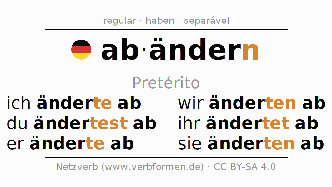 As formas de conjugação do verbo abändern (modificar, alterar) no pretérito são: ich änderte ab, du ändertest ab, er änderte ab, wir änderten ab, ihr ändertet ab, sie änderten ab