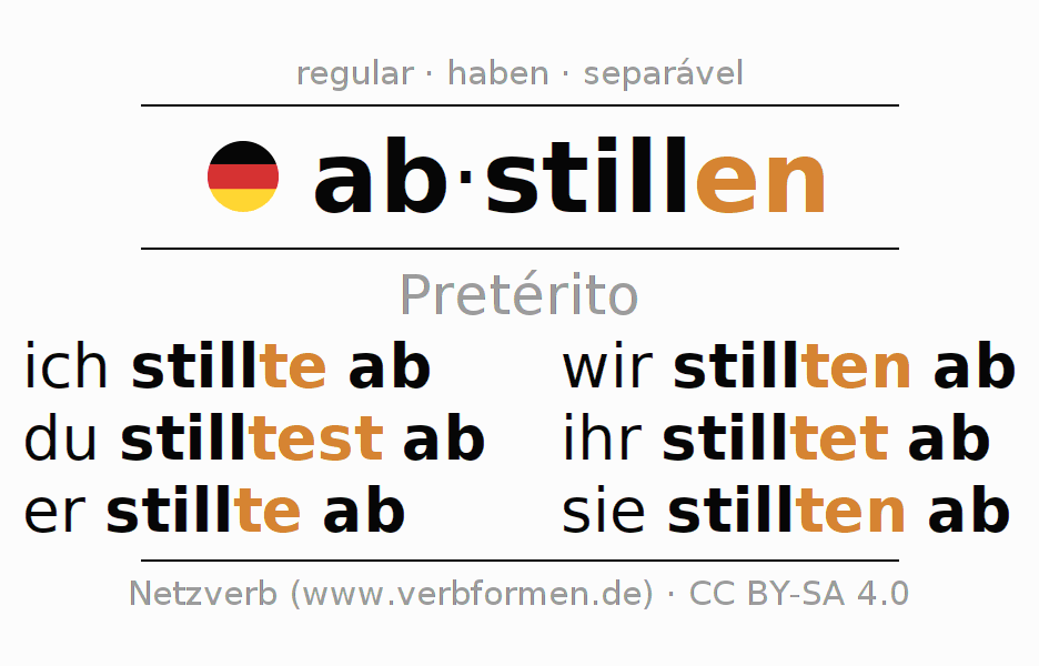 As formas de conjugação do verbo abstillen (desmamar) no pretérito são: ich stillte ab, du stilltest ab, er stillte ab, wir stillten ab, ihr stilltet ab, sie stillten ab