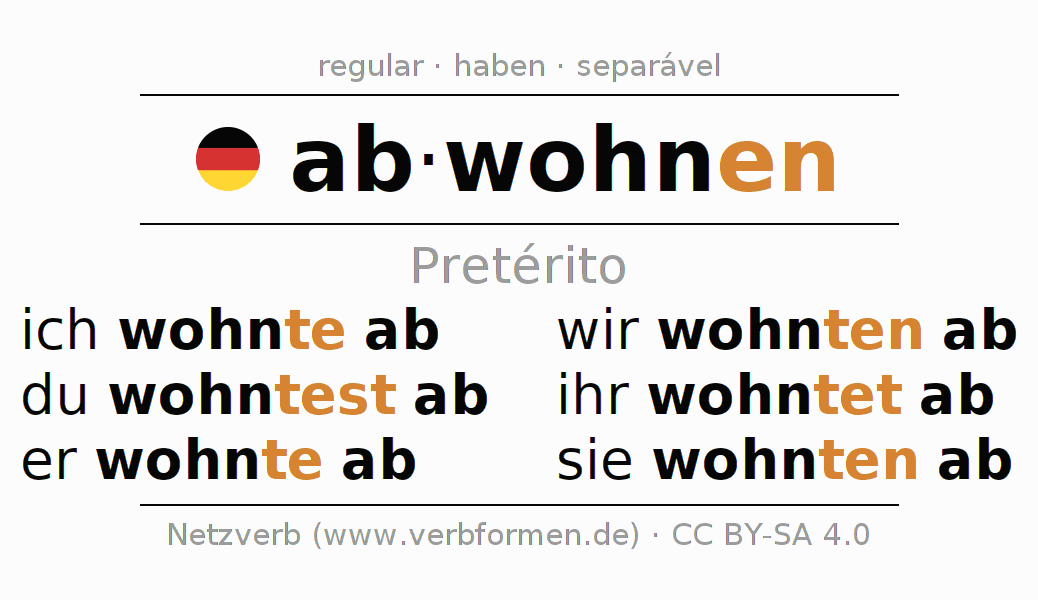 As formas de conjugação do verbo abwohnen (desgastar, usar até desgastar) no pretérito são: ich wohnte ab, du wohntest ab, er wohnte ab, wir wohnten ab, ihr wohntet ab, sie wohnten ab