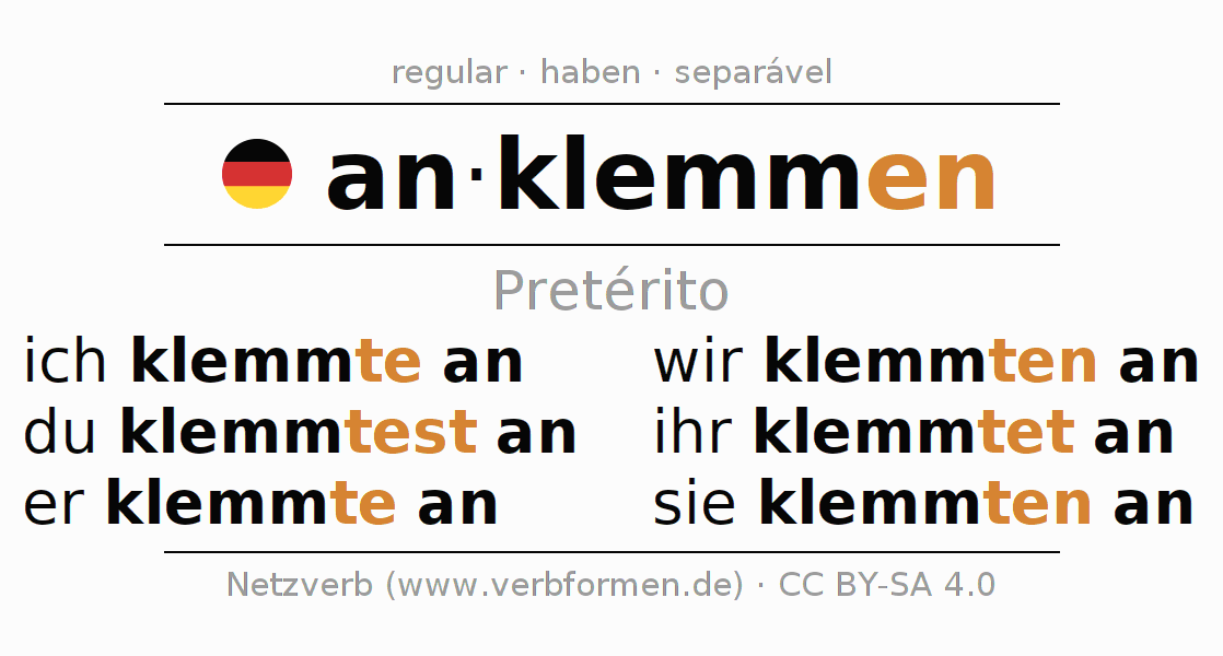 As formas de conjugação do verbo anklemmen (fixar, prender) no pretérito são: ich klemmte an, du klemmtest an, er klemmte an, wir klemmten an, ihr klemmtet an, sie klemmten an