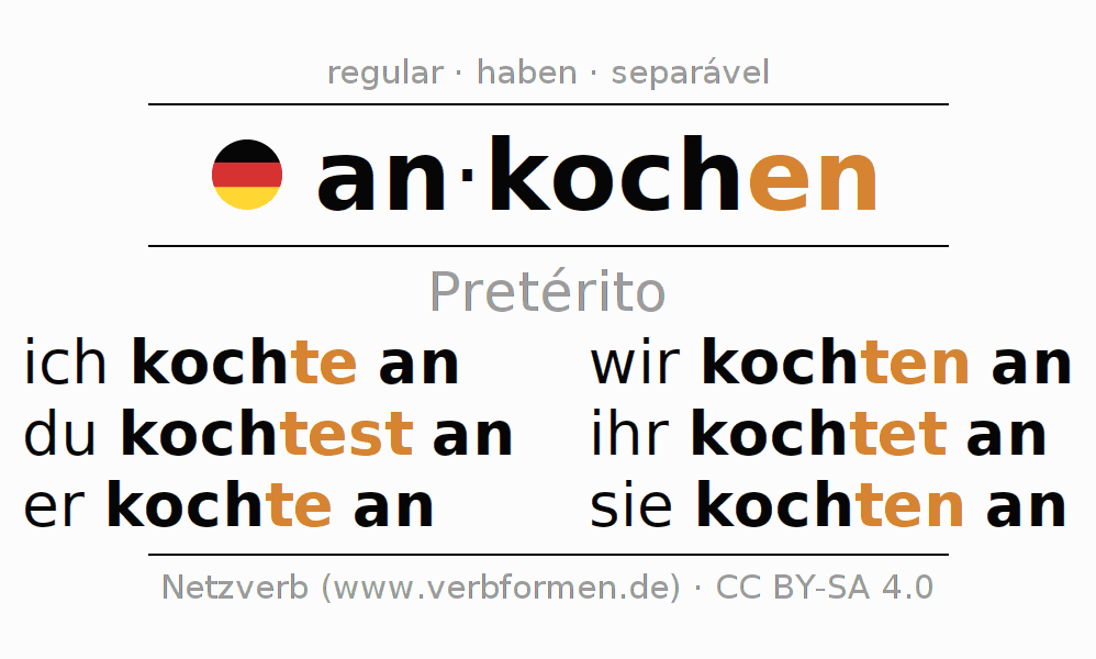 As formas de conjugação do verbo ankochen (cozimento breve) no pretérito são: ich kochte an, du kochtest an, er kochte an, wir kochten an, ihr kochtet an, sie kochten an