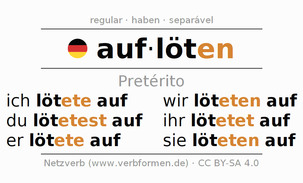 As formas de conjugação do verbo auflöten (soldar) no pretérito são: ich lötete auf, du lötetest auf, er lötete auf, wir löteten auf, ihr lötetet auf, sie löteten auf