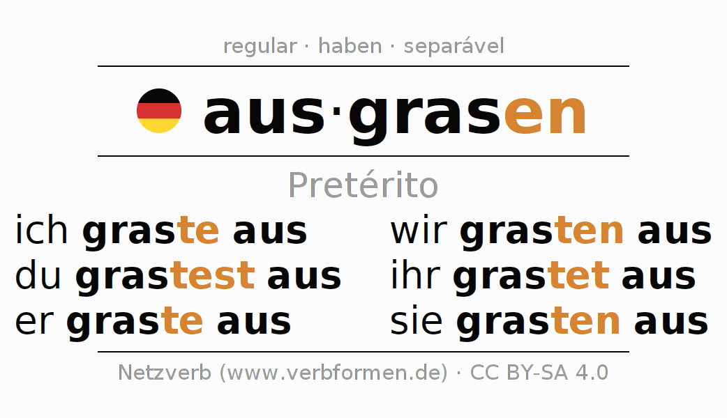 As formas de conjugação do verbo ausgrasen (sobrepastorear) no pretérito são: ich graste aus, du grastest aus, er graste aus, wir grasten aus, ihr grastet aus, sie grasten aus