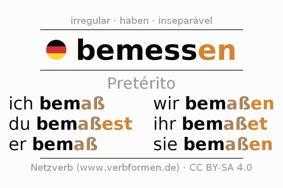 As formas de conjugação do verbo bemessen (dimensionar, medir) no pretérito são: ich bemaß, du bemaß(es)t, er bemaß, wir bemaßen, ihr bemaß(e)t, sie bemaßen