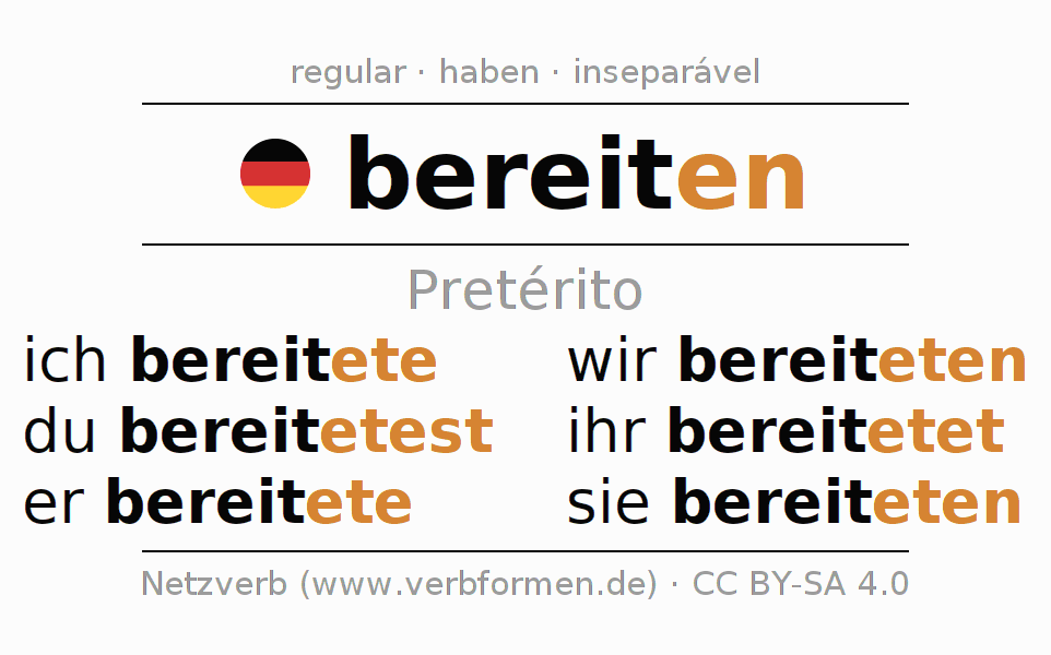 As formas de conjugação do verbo bereiten (preparar, arranjar) no pretérito são: ich bereitete, du bereitetest, er bereitete, wir bereiteten, ihr bereitetet, sie bereiteten