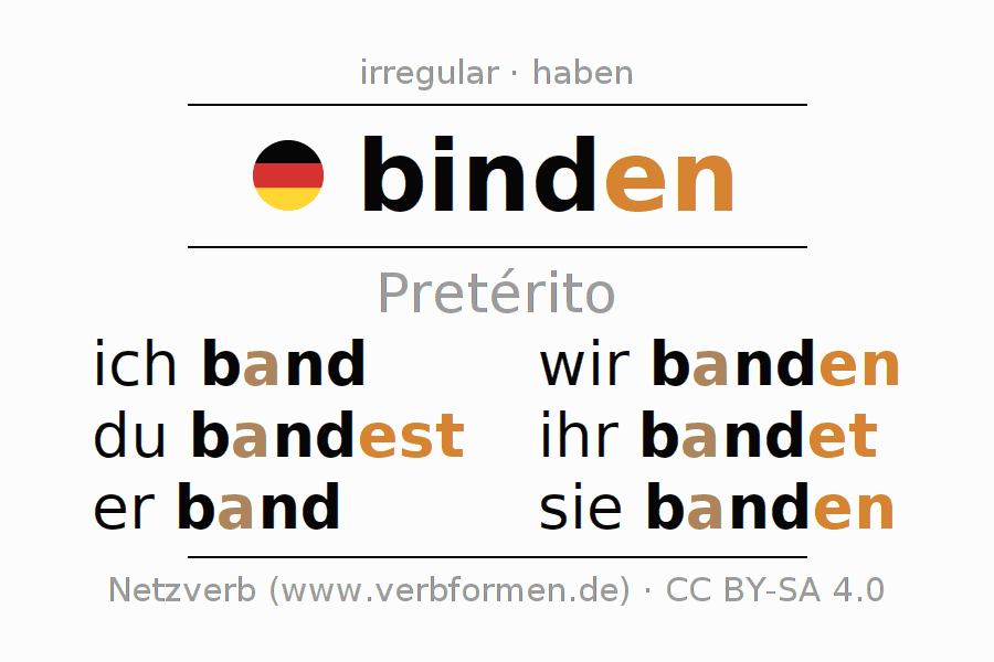 As formas de conjugação do verbo binden (ligar, amarrar) no pretérito são: ich band, du band(e)st, er band, wir banden, ihr bandet, sie banden