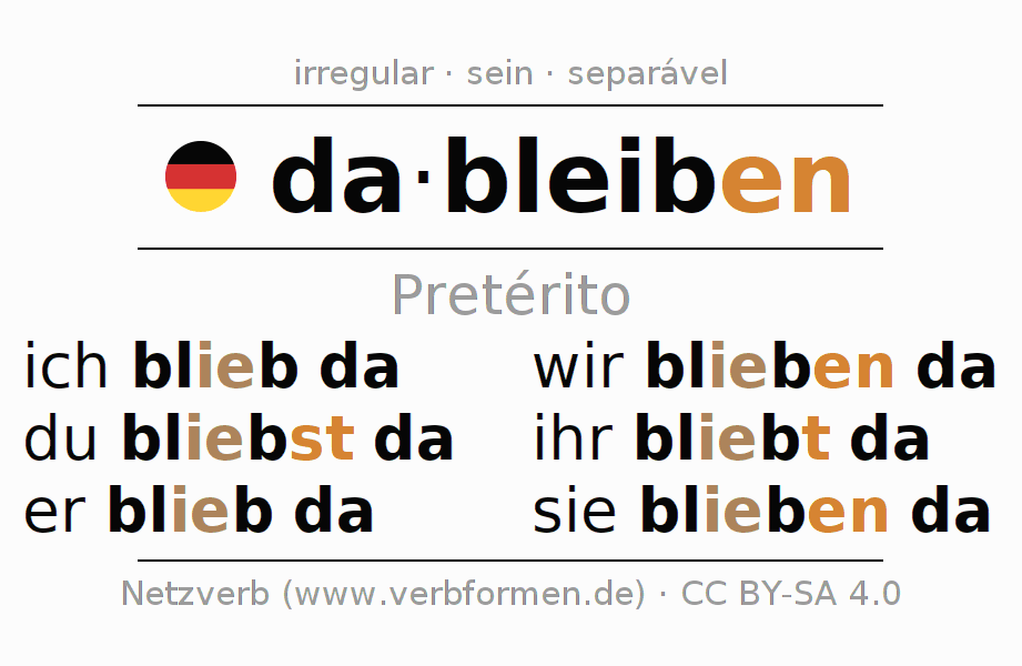 As formas de conjugação do verbo dableiben (ficar, permanecer) no pretérito são: ich blieb da, du bliebst da, er blieb da, wir blieben da, ihr bliebt da, sie blieben da