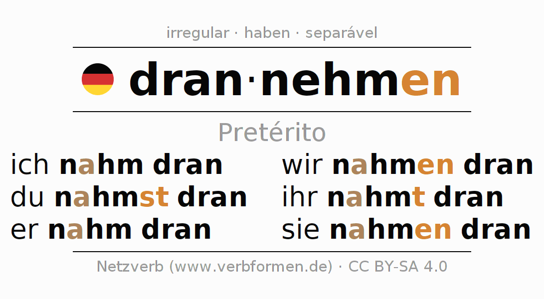 As formas de conjugação do verbo drannehmen (atender, chamar) no pretérito são: ich nahm dran, du nahmst dran, er nahm dran, wir nahmen dran, ihr nahmt dran, sie nahmen dran