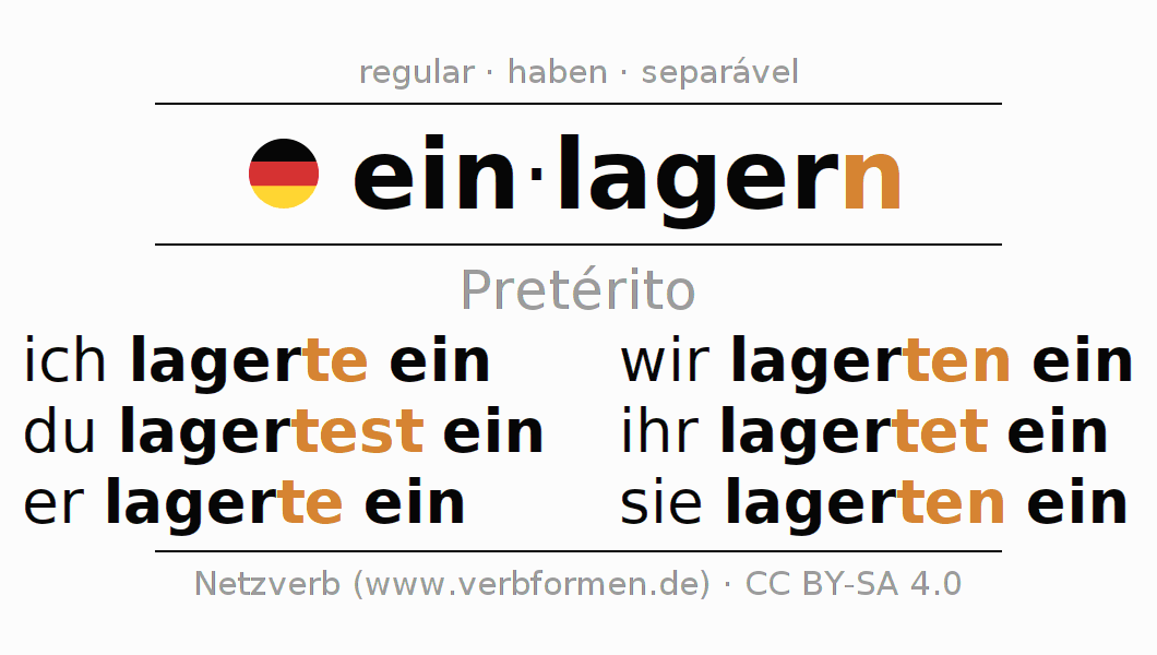 As formas de conjugação do verbo einlagern (armazenar, depositar) no pretérito são: ich lagerte ein, du lagertest ein, er lagerte ein, wir lagerten ein, ihr lagertet ein, sie lagerten ein