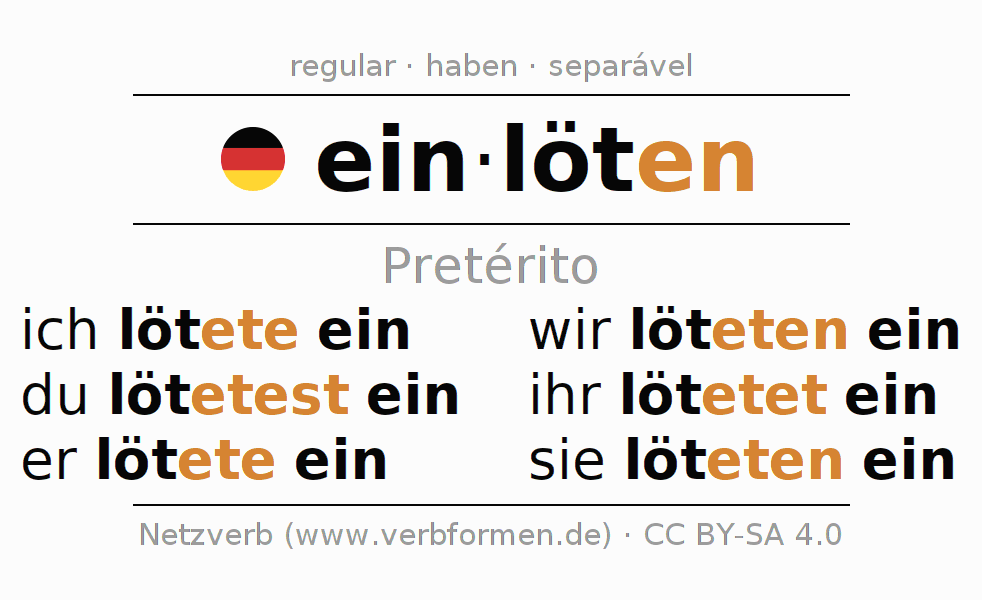 As formas de conjugação do verbo einlöten (soldar) no pretérito são: ich lötete ein, du lötetest ein, er lötete ein, wir löteten ein, ihr lötetet ein, sie löteten ein