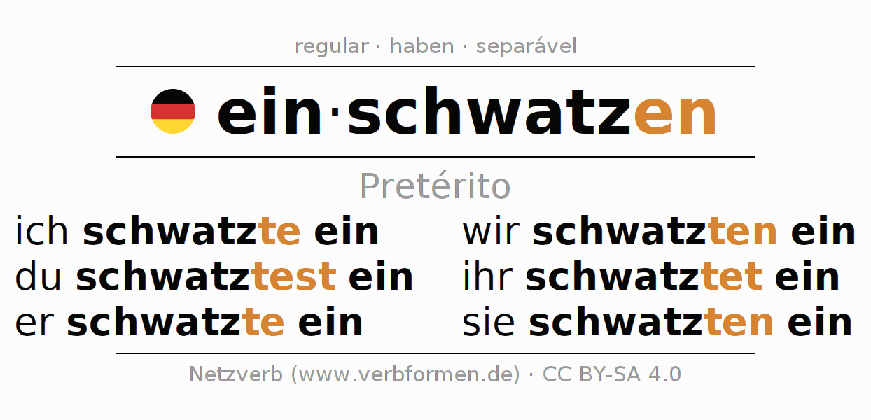 As formas de conjugação do verbo einschwatzen (encher os ouvidos, importunar) no pretérito são: ich schwatzte ein, du schwatztest ein, er schwatzte ein, wir schwatzten ein, ihr schwatztet ein, sie schwatzten ein
