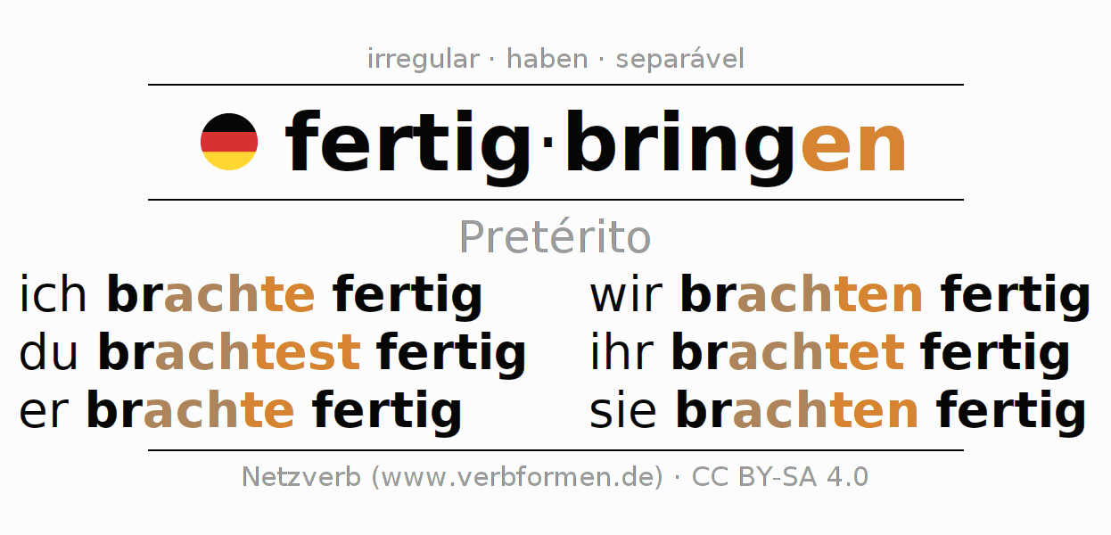 As formas de conjugação do verbo fertigbringen (realizar, completar) no pretérito são: ich brachte fertig, du brachtest fertig, er brachte fertig, wir brachten fertig, ihr brachtet fertig, sie brachten fertig