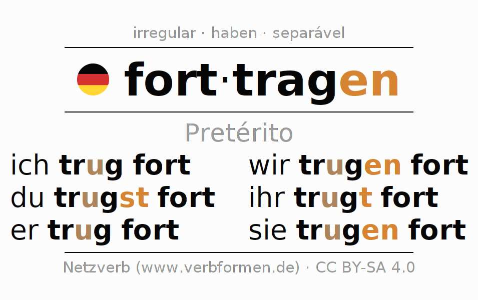 As formas de conjugação do verbo forttragen (levar, remover) no pretérito são: ich trug fort, du trugst fort, er trug fort, wir trugen fort, ihr trugt fort, sie trugen fort